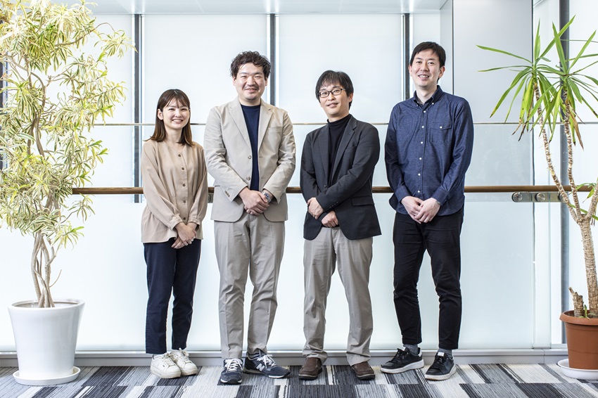 Our anime production service using original manga drawings was launched with the idea of helping support the future of manga and anime. It is an end-to-end content production service that transforms original manga manuscripts into high-quality anime, handling everything from planning to domestic and international broadcasting, as well as a variety of related services. We spoke with four members of the department about the goals and potential of the project: Tetsuya Hayama, who came up with the idea and built a broad network both inside and outside the company, along with Azumi Otaka, Masanori Wada, and Takumi Motohashi.