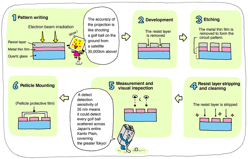 One of the key components in manufacturing semiconductors is the photomask. It functions like photographic negative film and serves as the master template to transfer semiconductor chip circuit patterns onto a base material called a silicon wafer. In other words, no matter how precisely the circuit is designed, without a photomask that can transfer it accurately, semiconductors cannot be mass-produced.