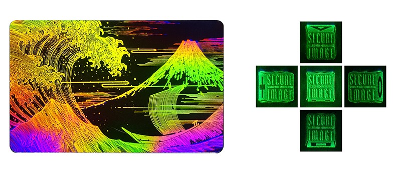 The high-brightness, high-definition embossed hologram (left), and the Lippmann hologram, which expresses three-dimensional depth both vertically and horizontally (right) |