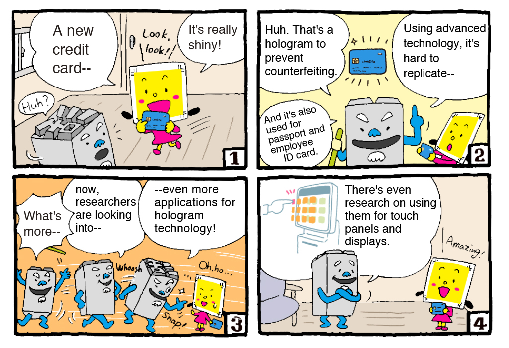 Shiny holograms can be found on a range of items such as credit cards, gift certificates, and branded goods. In addition to their design, they are effective in helping prevent counterfeiting thanks to advanced manufacturing techniques that cannot be replicated easily. Here, we will explore the cutting edge of holograms, not only for their strengths in design and security, but also as an emerging next-generation information display technology!