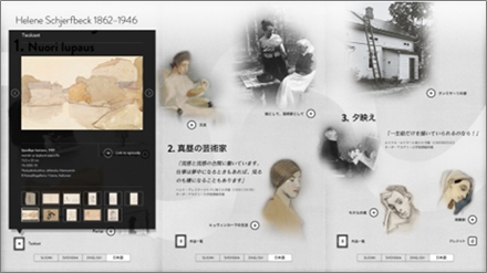 Developed by DNP in collaboration with Ateneum Art Museum, the "at Home"art viewing multimedia system was implemented at the "Helene Schjerfbeck:Reflections" travelling exhibition within Japan (2015-2016), which featuredworks loaned by Ateneum. A large number of visitors were thus able to use thissystem. Female artist Helene Schjerfbeck (1862-1946), whose paintings show adiverse range of styles that always draw deeply on her own inner vision, hasattracted much attention in recent years, not only in her native Finland butalso on the international scene. To design the "at Home" system, someone hundred of the artist's paper-based works (such as watercolors and drawings)were digitized , to which information for enhanced understanding of her lifeand work were added, in order to broadly discover and appreciate the works froma variety of angles. Schjerfbeck's life as an artist is divided into three parts-adolescence,prime of life and her later years - thus enabling visitors to decode the characteristicsof each epoch and the artworks produced at that time. The commentary informationis available in four interchangeable languages: Finnish, Swedish, English, andJapanese.