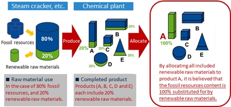 Input the necessary amount of renewable raw materials as calculated in 1 to a variety of products manufactured at the BASF plant, which usually use petro-derived raw materials. Thus substitution effect of the renewable raw materials for petro-derived materials is fixed.