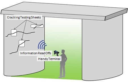 - As it is possible to perform read-offs for cracking in a simple mannereven in locations that are difficult to confirm by sight, oversights andomissions can be avoided. Cracking of even just several millimeters canbe detected by waving the reader-writer over the spot in question. No specialskill is required, and workers can accurately perform the required testing.Data obtained by the reader-writer can be transferred to a computer allowingfor the creation of testing logs in a simple manner