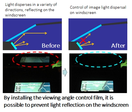 By using a viewing angle control film that concentrates light, such as images, in a downwards fashion, visibility from the driver's seat has been improved and reflection onto the windshield prevented.