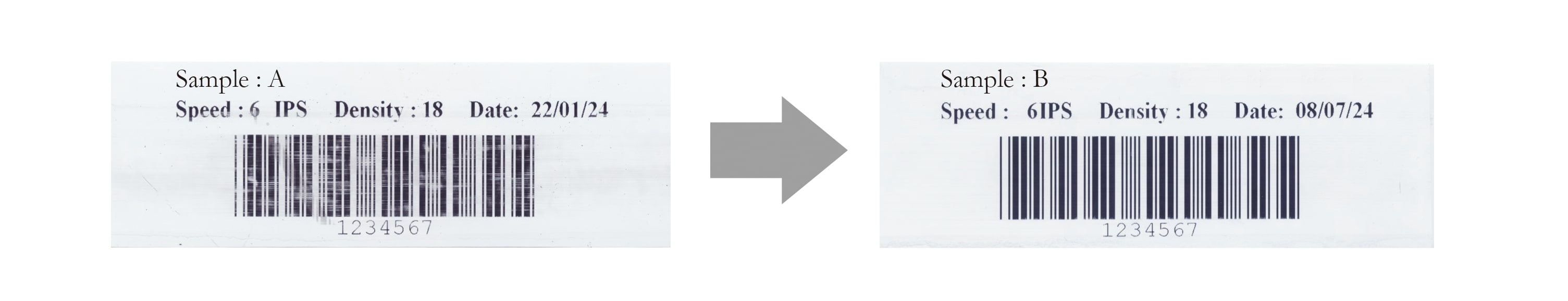 Image following friction durability test, entailing rubbing the printed area 300 times with cotton soaked in alcohol. (JIS L 0849 compliant): The new product, R380 (right image) is more durable than our existing product (left image).