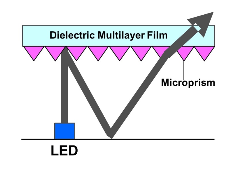 • Light emitted directly above the LED can cause dot appearance. The dielectric multilayer coating of the new film does not transmit straight lines of light, but only transmits light at a designed angle of incidence, reducing dot appearance.