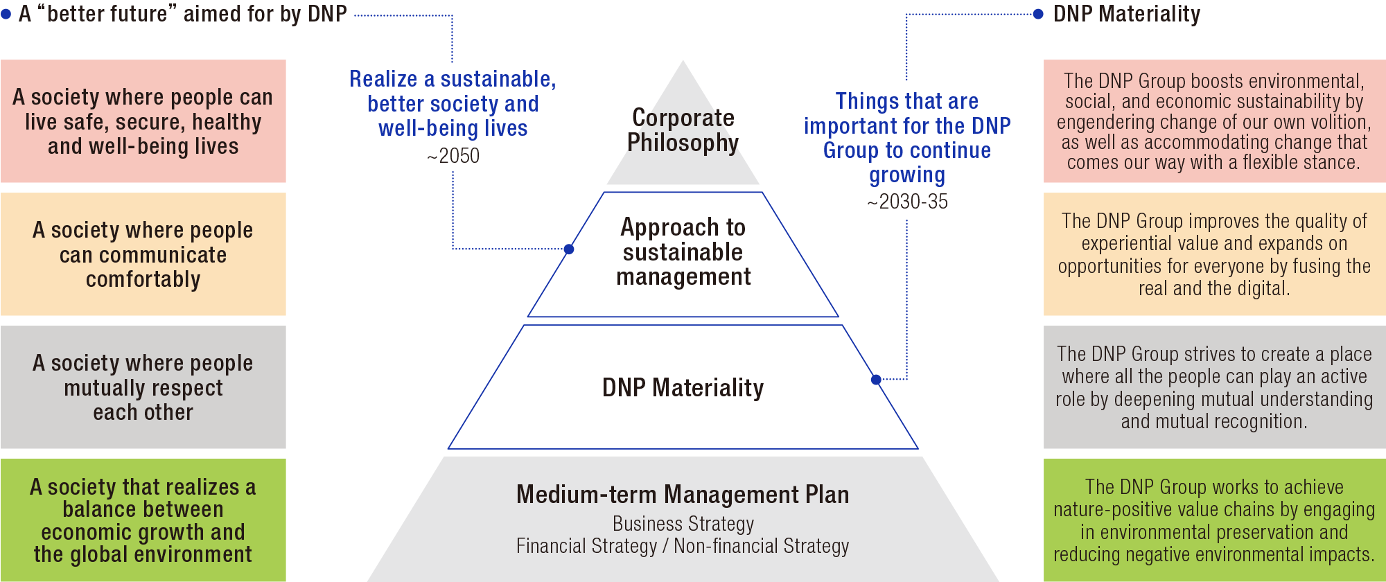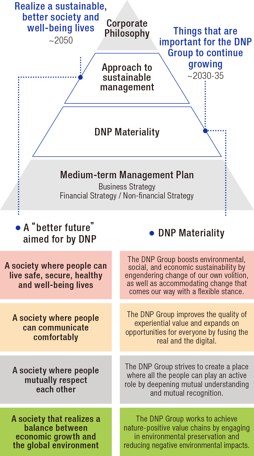 Based on the Corporate Philosophy, the DNP Group aims to realize “a sustainable, better society and well-being lives" as a sustainable management concept and is taking the initiative in conducting business activities to create a “better future.”