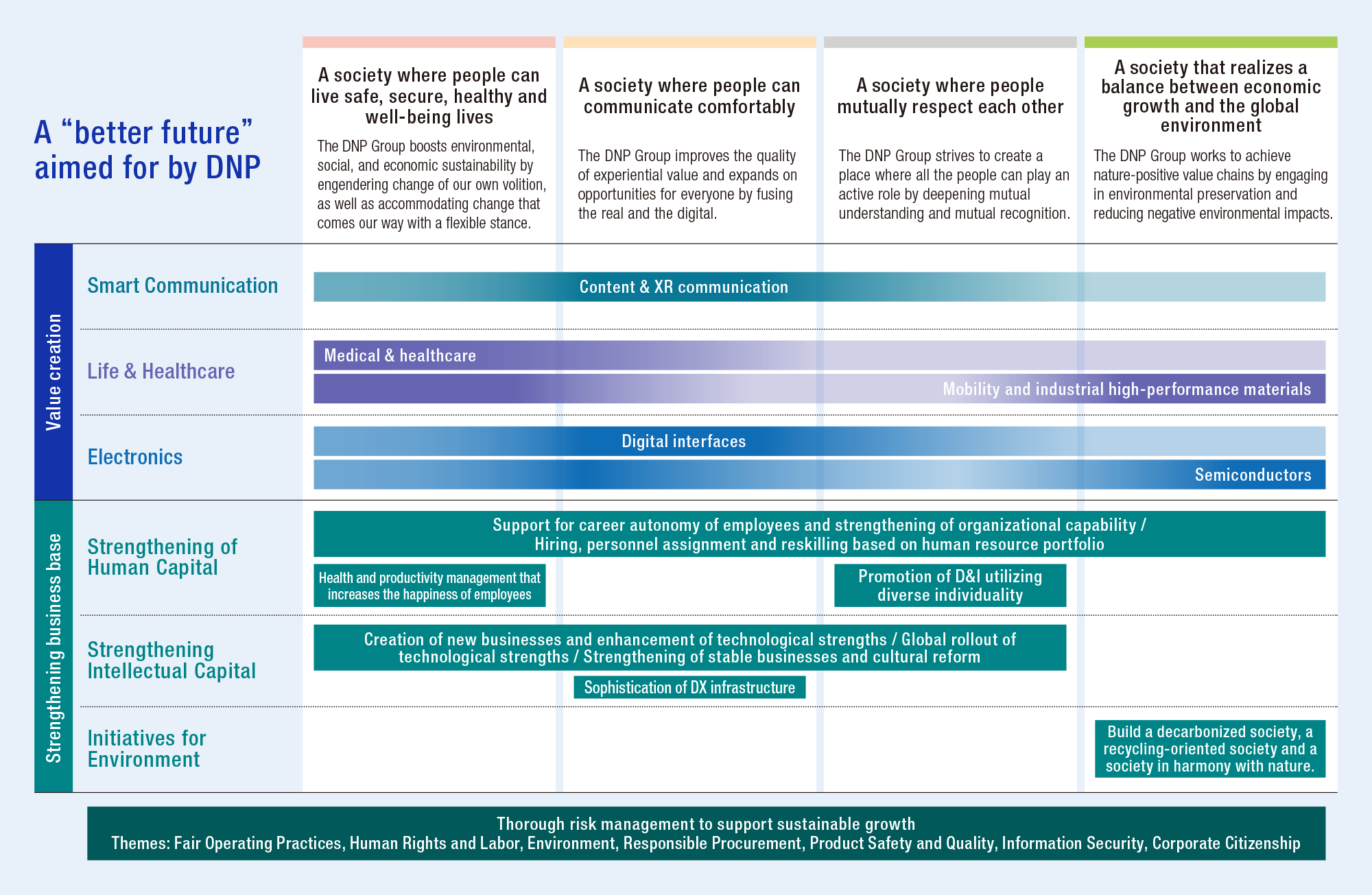 Identifying and prioritizing social issuesBased on the relationship with our Corporate Philosophy and Business Strategy, identification of short-, medium- and long-term risks and opportunities and an assessment of the impact of these on management, DNP has specified the four societies it aims for as its “better future” and has outlined what it should do to realize this and the value it will provide.
