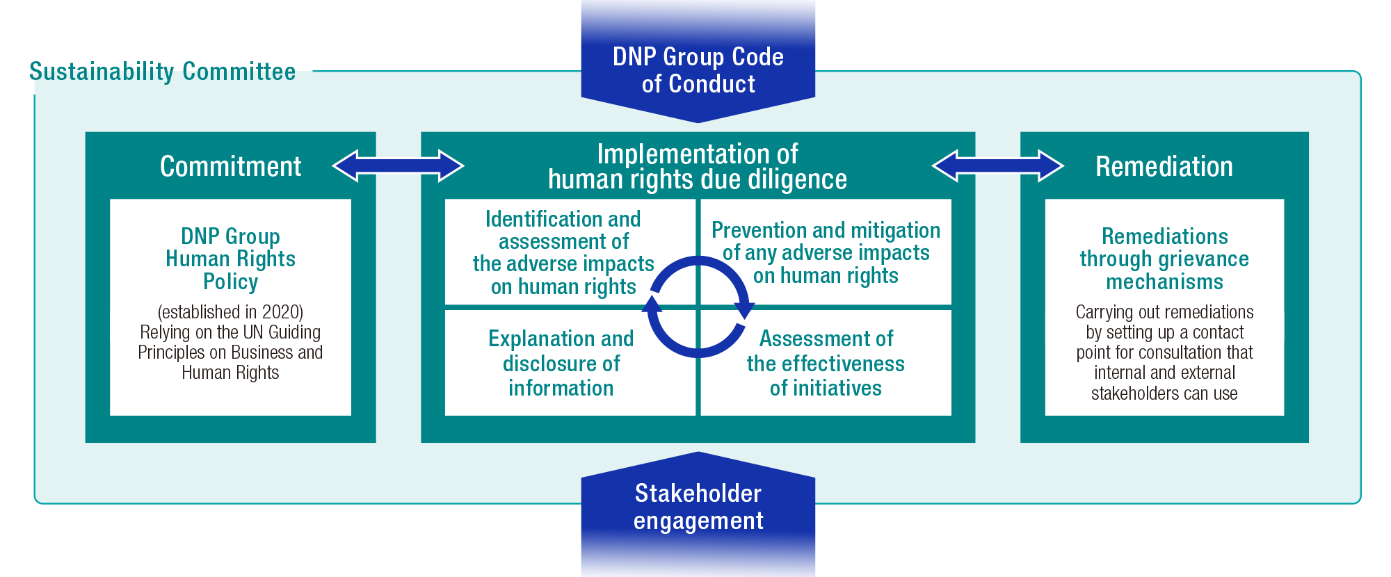 Respect for human dignity and diversity is a component of the DNP Group Code of Conduct. At DNP we respect for the diversity of each individual’s unique culture, nationality, beliefs, race, ethnic group, language, religion, gender, age, or ideas. After deliberations of the Board of Directors, DNP established the DNP Group Human Rights Policy in 2020, respecting international norms, such as the International Bill of Human Rights and the International Labour Organization (ILO) Declaration on Fundamental Principles and Rights at Work. In line with this, various organizations, including the Personnel & Employee Relations Division, Diversity & Inclusion Promotion Department, Sustainability Promotion Department, Purchasing Division, Strategic Business Planning & Development Division and Legal and Compliance Department, work together to promote initiatives for human rights.