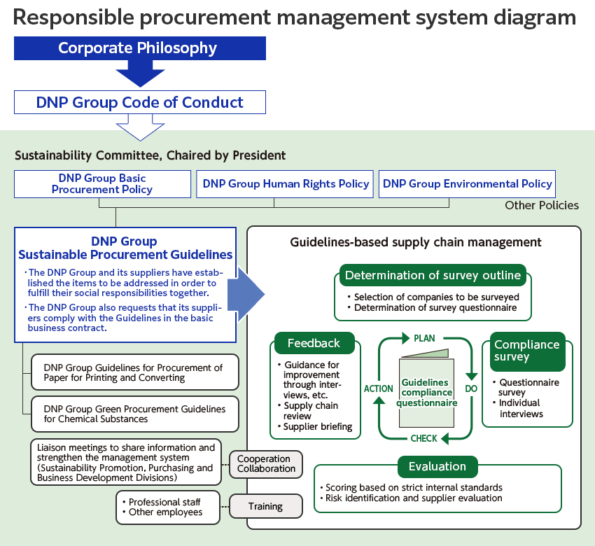 In a meeting of the Sustainability Committee chaired by the President, we confirmed our commitment to responsible procurement practices that take social and environmental issues such as human rights and climate change into account across the entire supply chain, and based on which, we have been formulating various types of guidelines and promoting a range of activities to raise the effectiveness of these guidelines. DNP has established the Basic Business Contracts with our business partners in accordance with the DNP Group Sustainable Procurement Guidelines. For particularly critical issues, we have developed specific guidelines, such as the DNP Group Guidelines for Procurement of Paper for Printing and Converting and the DNP Group Green Procurement Guidelines for Chemical Substances and provide guidance accordingly. We also continuously strengthen our supply chain management through regular surveys of business partners regarding their compliance with the Sustainable Procurement Guidelines, feedback sessions and various briefings. Internally, we provide specialized training and support for professional certification to procurement staff to enhance their understanding of procurement fundamentals and management techniques. This training ensures that our employees are well equipped to act appropriately in their roles.