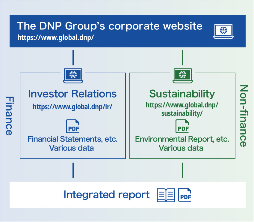 DNP Group's Information Disclosure On the DNP Group corporate website, there is “Investor Relations,” which mainly describes financial information, and “Sustainability,” which mainly describes non-financial information. A variety of data, including financial statements, are contained in “Investor Relations.” “Sustainability” features data including environmental reports. Integrated Reports that describe financial information and non-financial information in an integrated manner are also published in a booklet version.